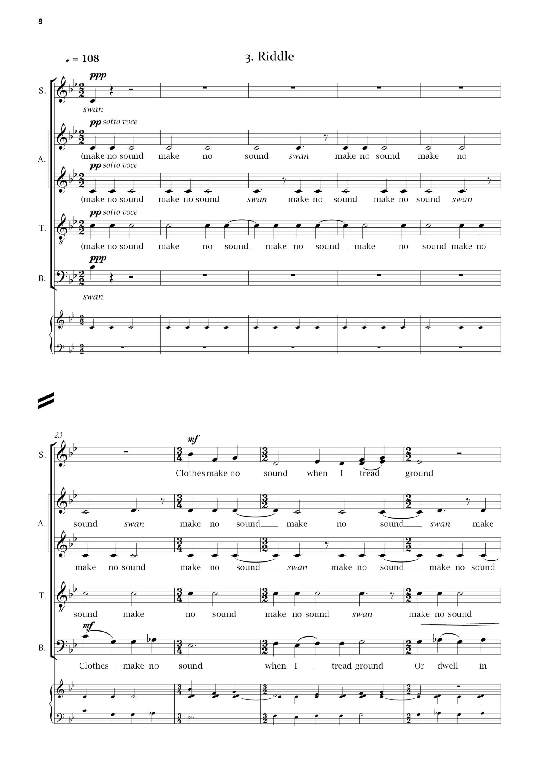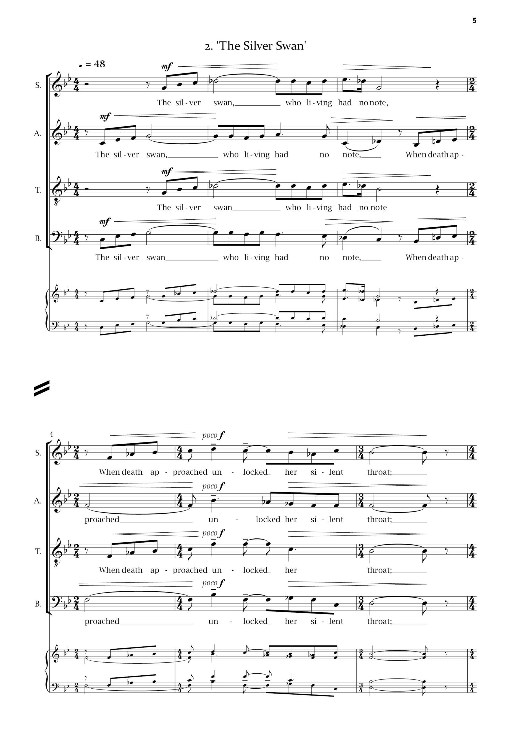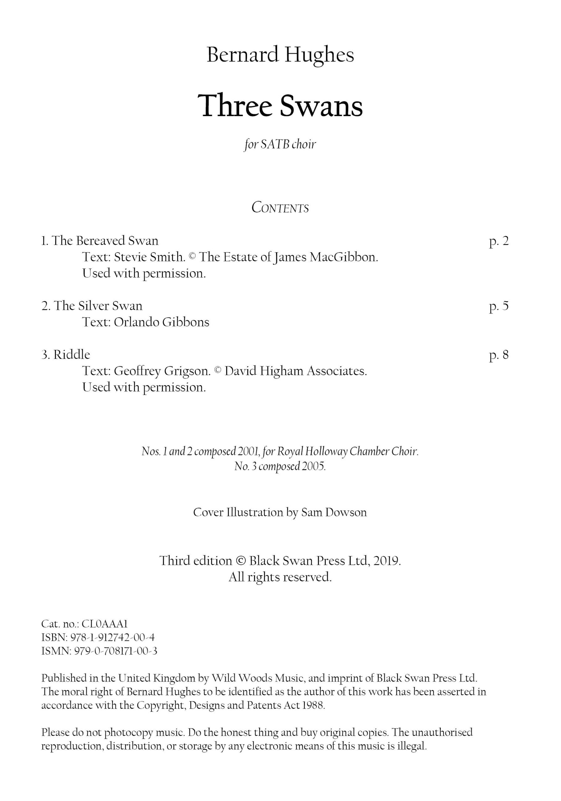 Swans have long held a fascination for poets and musicians, often taking on metaphorical meanings. The three poems here are wide-ranging in tone and historical background, and the musical settings are equally varied. The three movements can be performed separately or as a set.